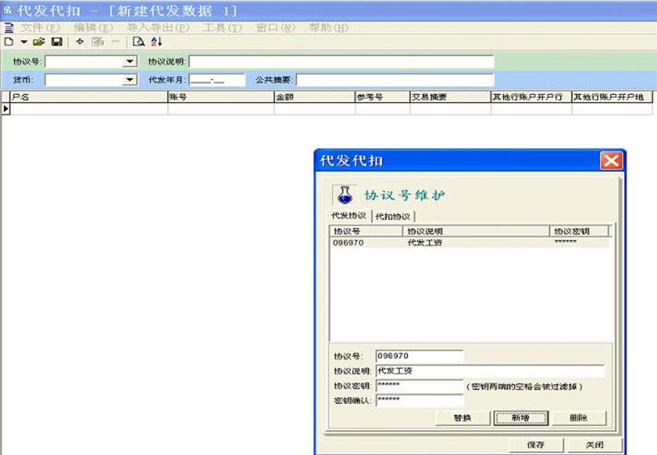 3、将协议号、协议说明、协议密钥输入之后点击“新增”,再点“保存”(协议号、协议密码通过开户行获得)协议说明一般填写代发类型,如:“代发工资”。