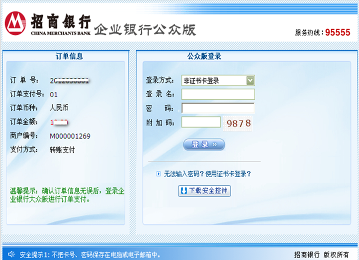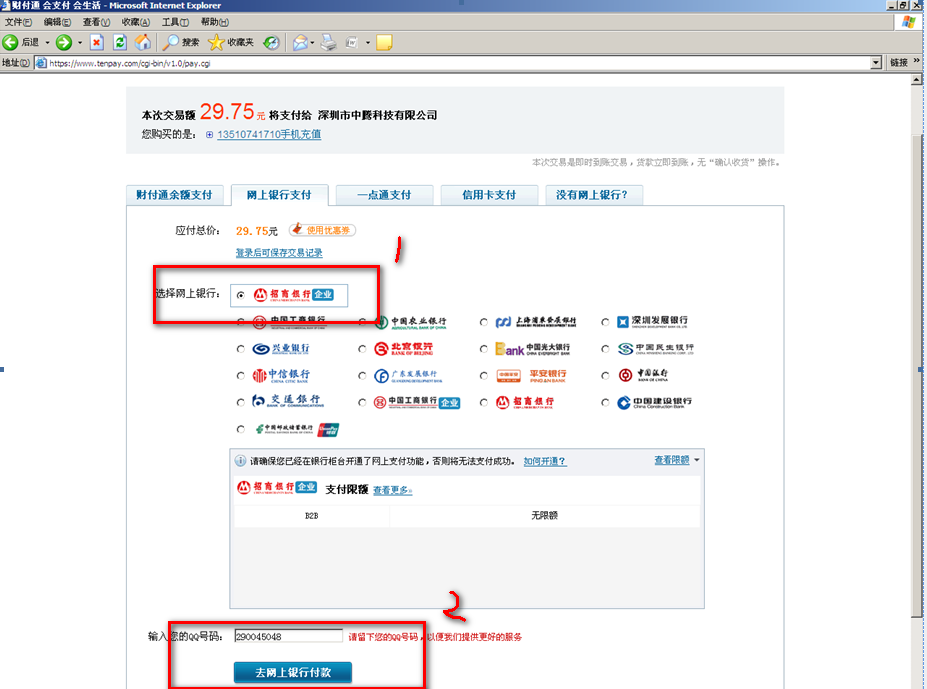 第一步:登录商户的网站,选定商品后,选择网上银行支付----招商银行(企业),点击“去网上银行付款”;