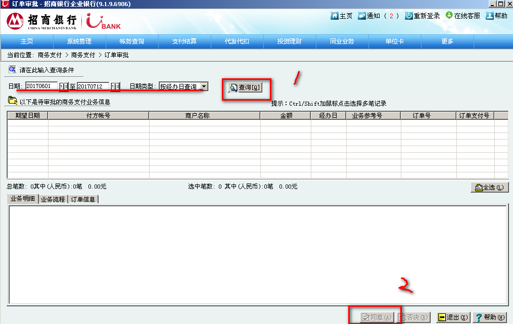 第五步:请指导客户用审批用户登录企业银行,在“商务支付—审批”界面对该笔订单进行审批同意即可。