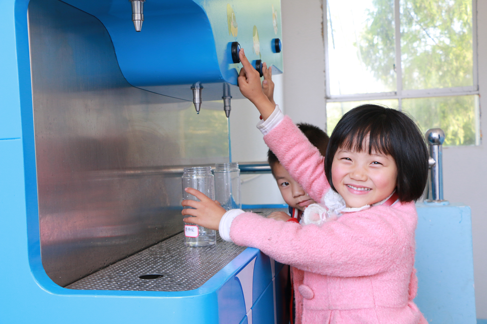 设备安装:供应商将净水设备运送安装到学校,当地公益伙伴机构监测验收,保证设备的良好使用,并为学生配备儿童水杯;