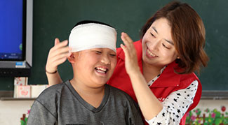 崔鹏,来自北京的医护人员,为孩子们准备的是健康与安全课。看着台上被白纱布一圈圈包裹头部的同学,台下孩子们都忍不住笑了出来,但当自己动手为同桌包扎时,他们又是那么的认真,仿佛在做一件工艺品。