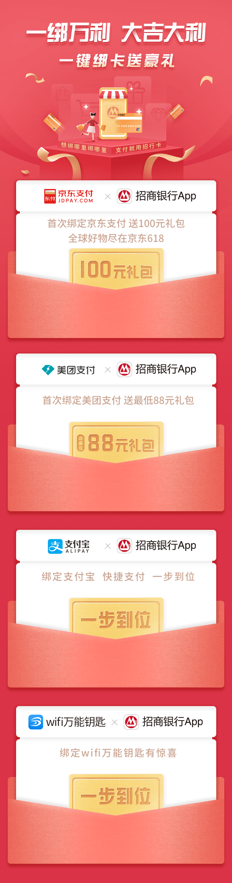 1、活动期间使用招商银行借记卡在指定渠道首次绑定美团支付,可享最低88元美团组合券大礼包;使用招行借记卡首次绑定京东支付,可享最高88元京东券礼包。首次绑定成功后,平台方将自动发送礼包到用户对应的美团、京东账户。