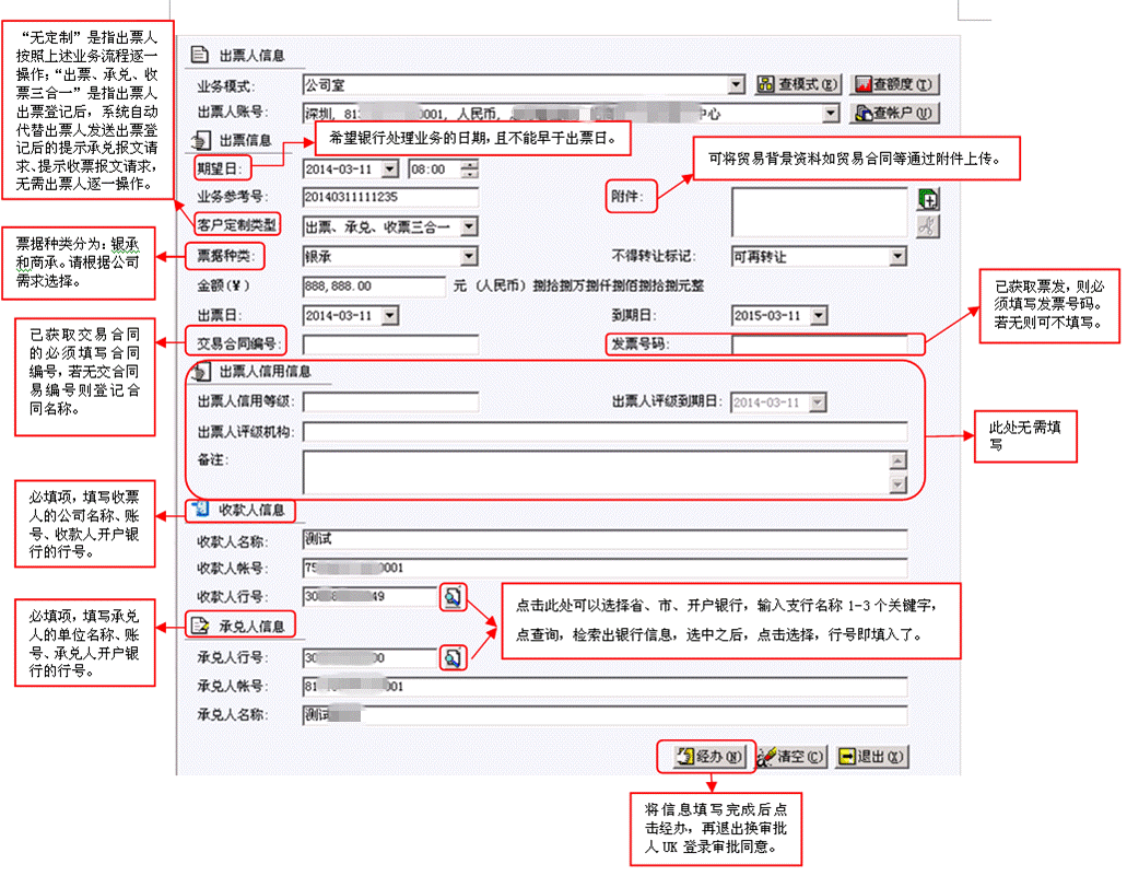 贵公司需要开人行电票给其他公司的时候,贵公司网银经办员请点击网银上的“供应链金融”—“人行企业电子票据业务”—“出票登记申请经办”。进入页面后,可查看下图指导操作开票流程。