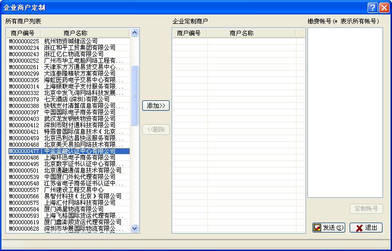 用任意系统管理员登录后,进入商户支付的商户定制,将M000000477中金金融认证中心有限公司从所有商户列表中添加至企业定制商户,然后点击发送即可。(注:M000000XXX为商户编号,可凭此编号判断用户需要定制的商户名称)