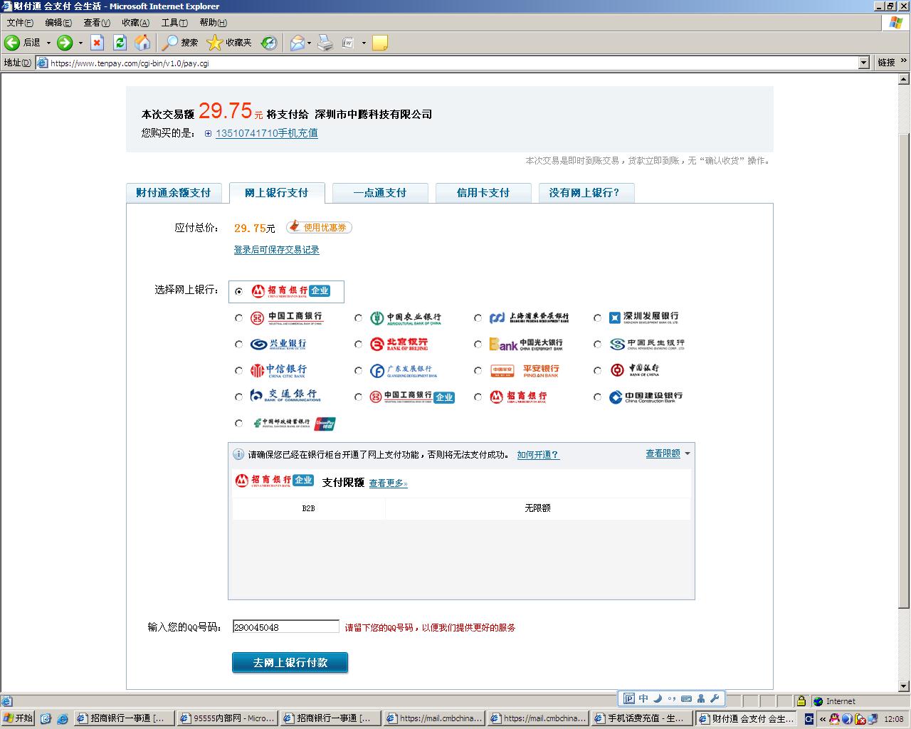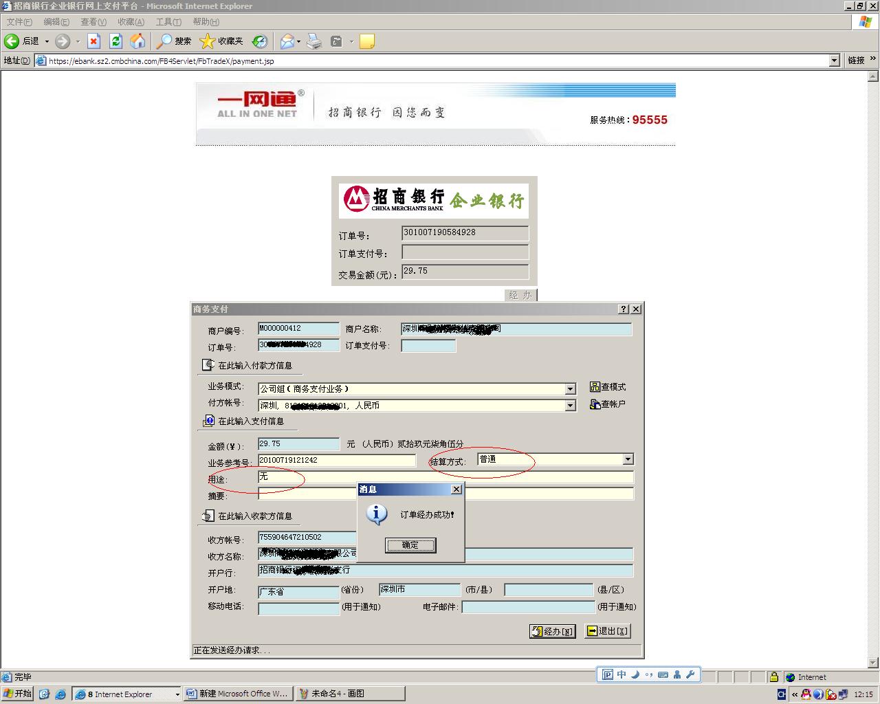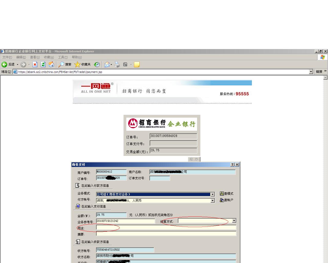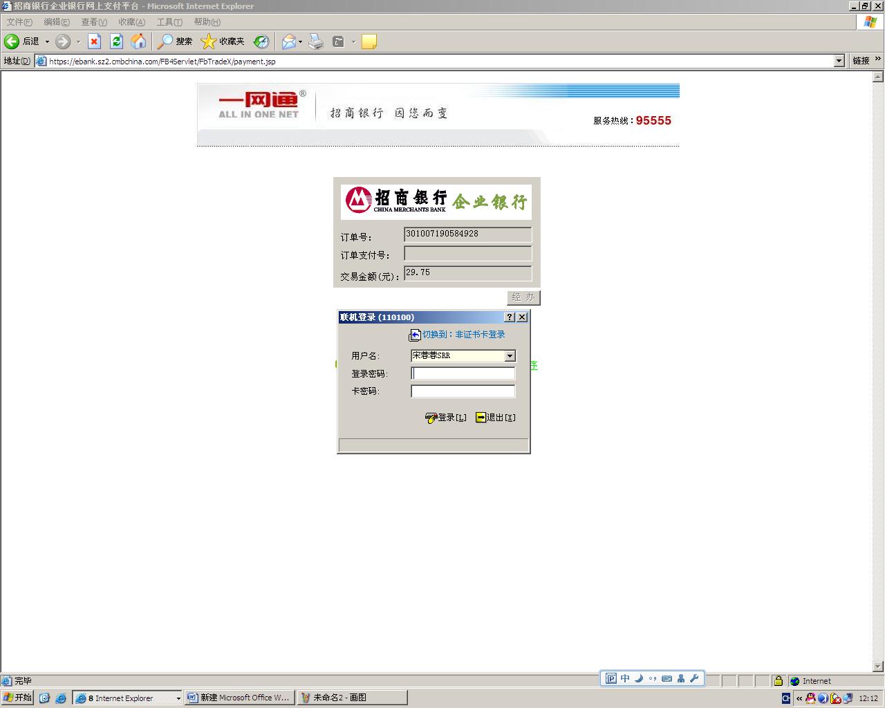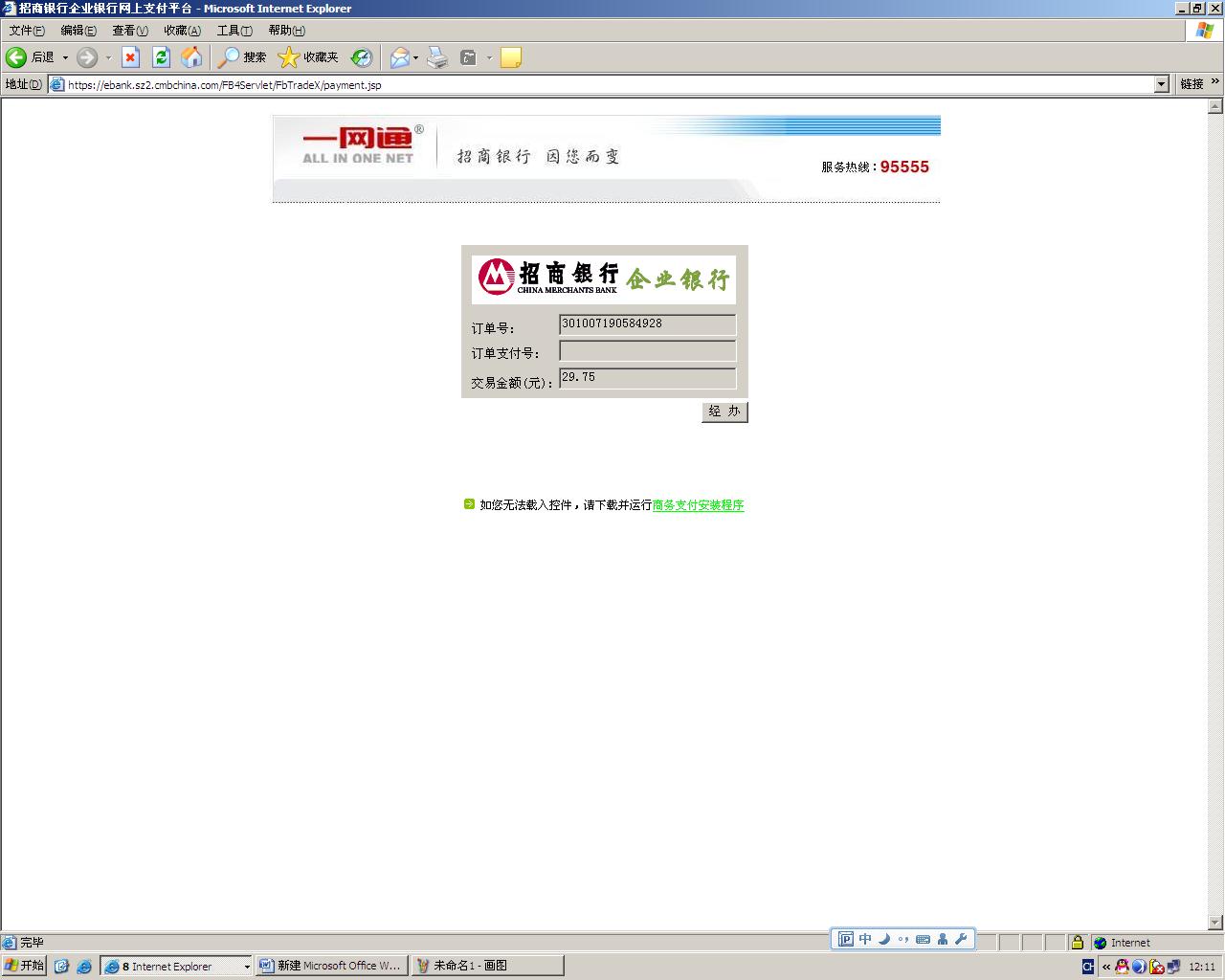 - 第一步:登录商户的网站,选定商品后,选择网上银行支付----招商银行(企业),点击“去网上银行付款”;