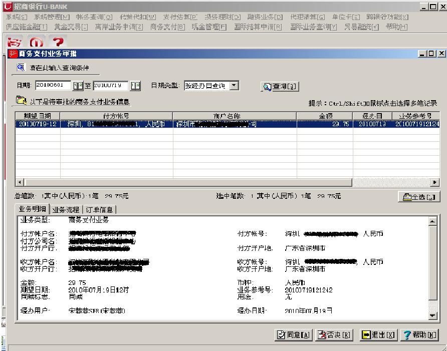 第七步:请指导客户用审批用户登录企业银行,在“商务支付—审批”界面对该笔订单进行审批同意即可。