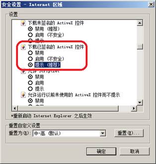 - 【流程说明】自动升级流程是指客户在商务支付过程中按提示一步一步完成升级。客户所使用的IE浏览器“Internet” 安全选项为默认设置。即客户没有把招行网址加入安全站点且选项“下载已签名的ActiveX控件”选择“提示(推荐)”,如下图: