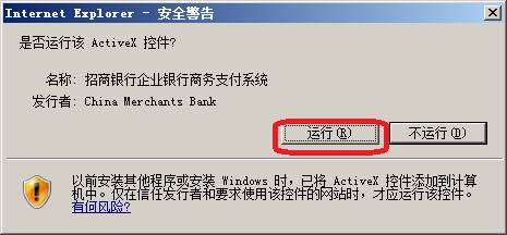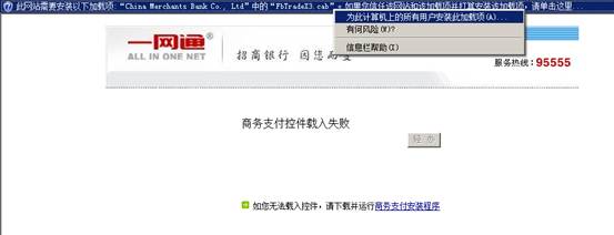 企业在商户下订单后进行支付时,当跳转到招行网站,则会出现如下界面。点击IE浏览器上方的提示,选择“运行加载项”