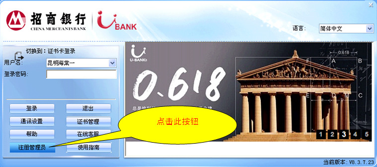 最新版本下载操作请点此查看 - 第一步:请收到银行通知后打开登录界面(须8.3.7版或以上版本客户端),点击界面左下角“注册管理员”按钮进行注册管理员操作。
