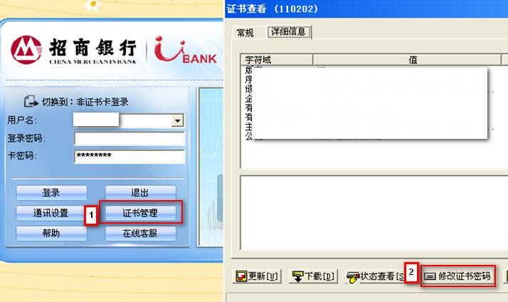 方法2:用户打开企业网银后,只需输入用户名和证书卡密码后,请点击“证书管理”—“修改证书卡密码”。