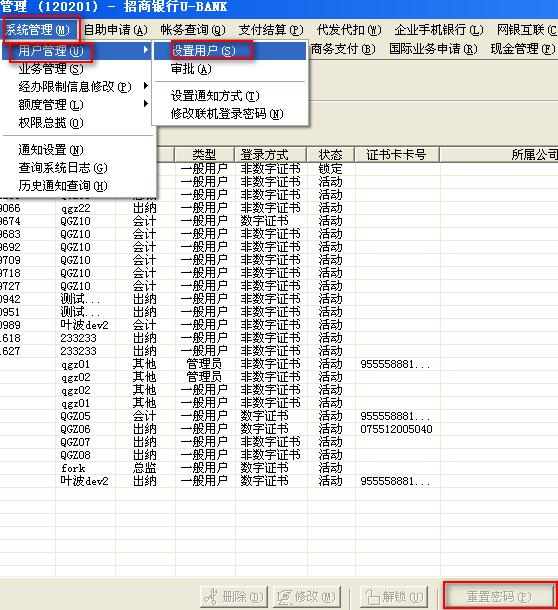 一般用户可能会遗忘登录密码,系统管理员可登录企业网银后,请点击“系统管理”—“用户管理”—“设置用户”后,再请选中要重置密码的用户后,点击下面菜单的“重置密码”。