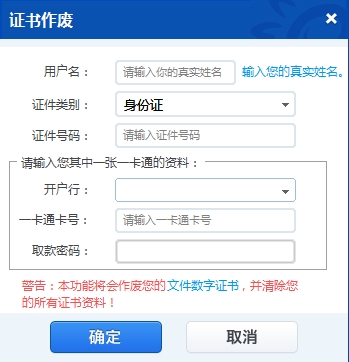 四:输入您的姓名、开户证件号码、一卡通账户信息,确定作废证书